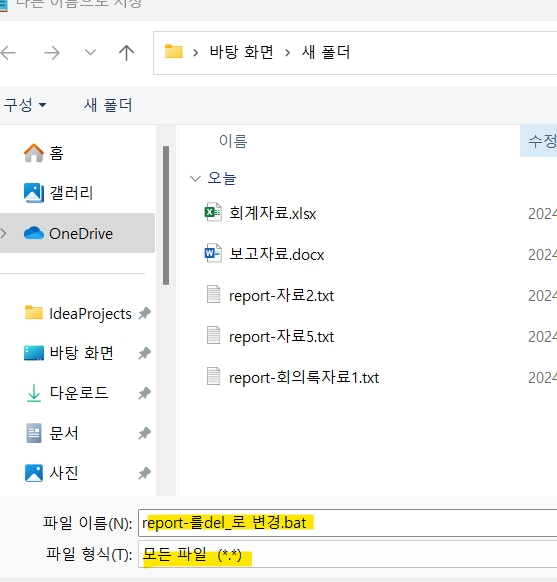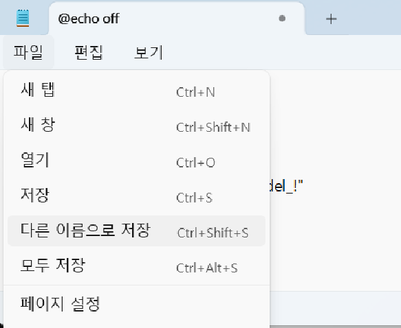 2. 다른이름으로 저장을 통해 bat파일로 저장합니다.