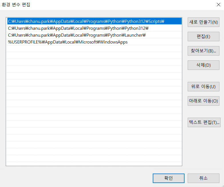 - 파이썬 설치 경로 (예: C:\Users\YourUsername\AppData\Local\Programs\Python\Python39\)가 포함되어 있는지 확인합니다.