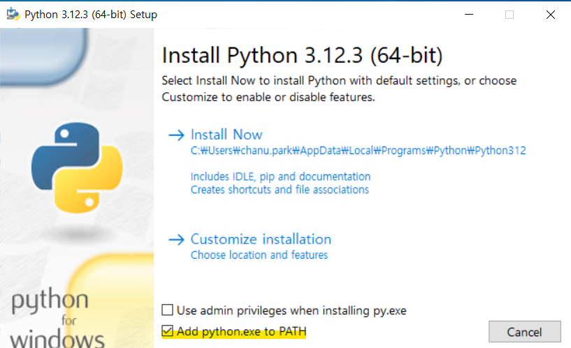 - Add Python to PATH 옵션을 체크하고 Install Now를 클릭합니다.