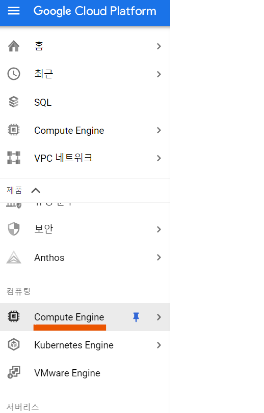 [컴퓨팅] 목록에서 Compute Engine을 선택해줍니다.(편리를 위해 고정핀으로 설정해주세요 ! 마우스를 가져다두면 고정핀 버튼이 보입니다)
