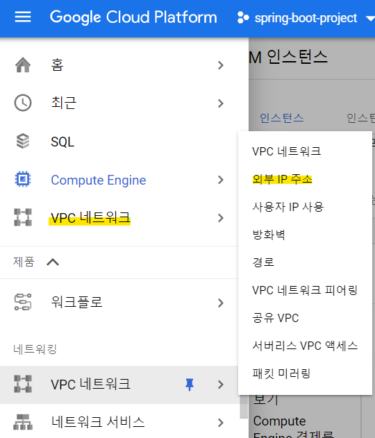 고정 IP 할당을 위해 네비게이션 바 메뉴 중 네트워크(VPC 네트워크 - 외부 IP 주소) 메뉴를 클릭합니다.