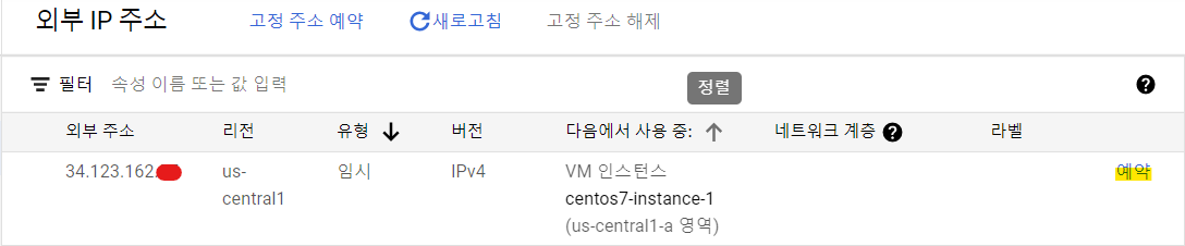 위에서 확인된 IP와 외부 주소가 동일한지 확인 후 오른쪽 끝 예약 버튼을 클릭합니다.