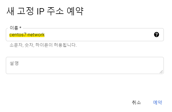 이름 및 네트워크(*) (위에서 저장해놨던 CentOS7 고정 IP)를 기입하여 완료 버튼을 클릭합니다.