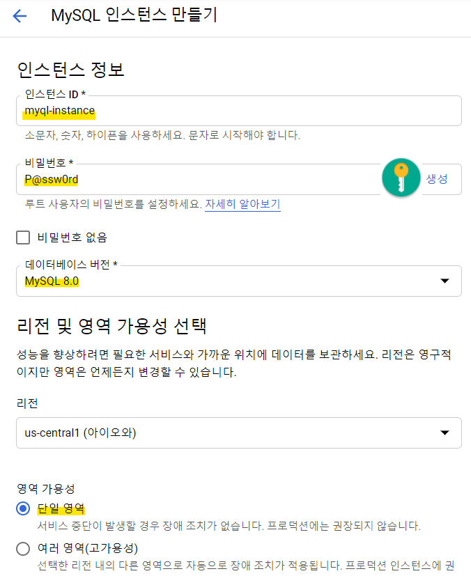 형광 부분 입력을 해줍니다. 저는 [영역 가용성]에서 단일 영역(Test Server 이기 때문)을 선택하였습니다.