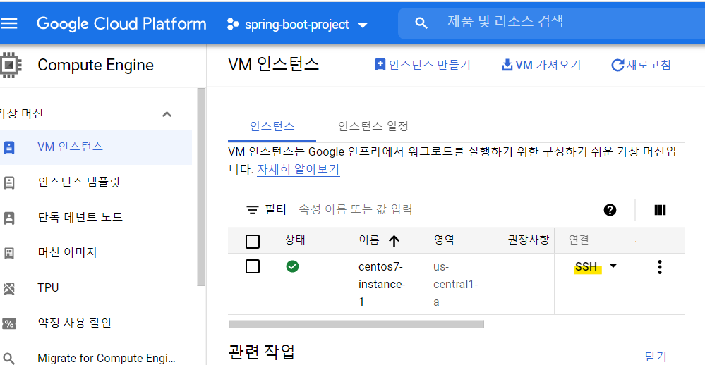 VM Instance(Compute Engine) 메뉴에 들어와 아까 생성한 CentOS7을 SSH로 연결해줍니다.