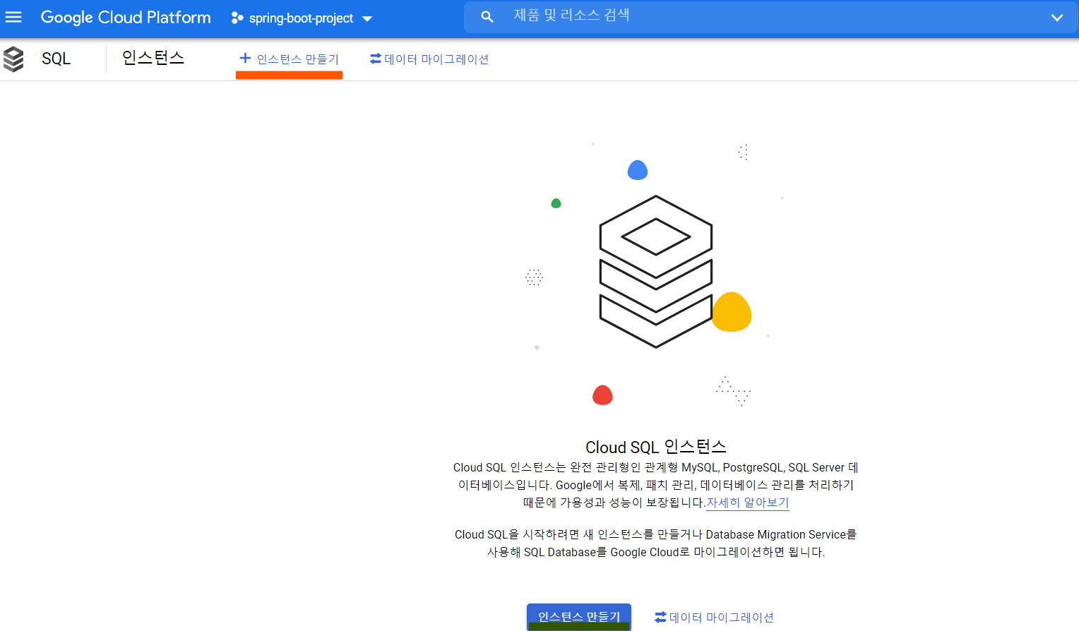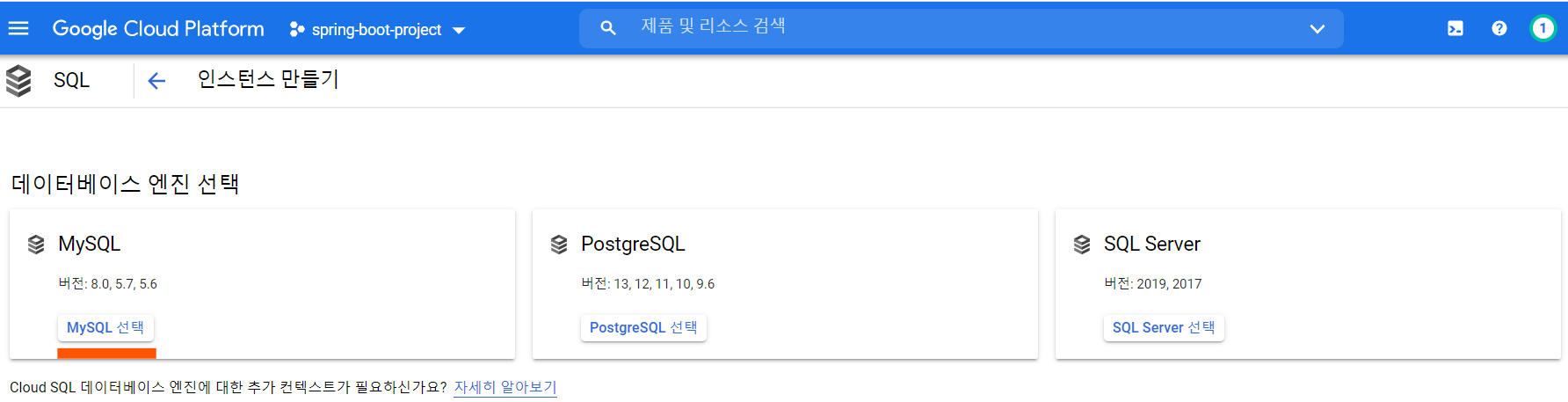 상단 혹은 하단 인스턴스 만들기를 통해 SQL Insatnce를 생성해줍니다.