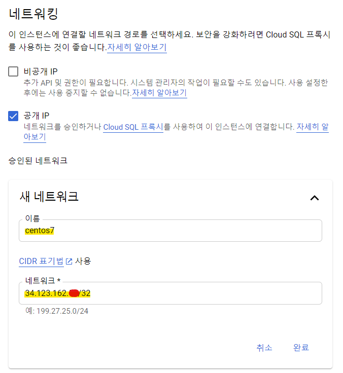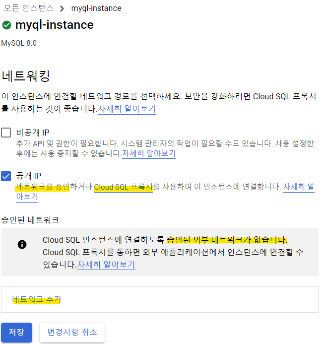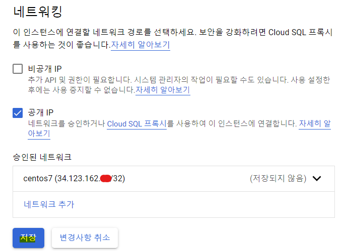설정 부분을 보시면 아무리 공개 IP라 되어있더라도, 네트워크 승인 혹은 Cloud SQL Proxy를 사용해야 연결이 가능합니다. 저희는 네트워크 승인을 진행토록 하겠습니다.