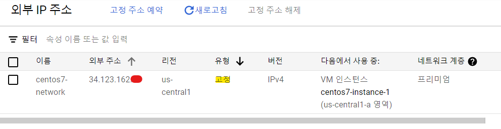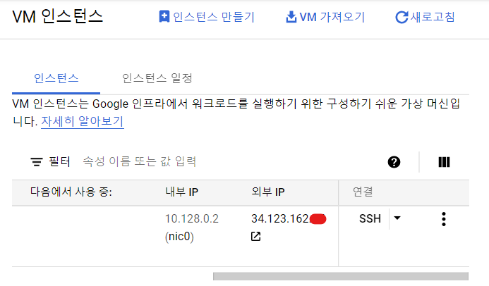 생성된 VM Instance & 외부 IP 정보를 확인합니다.